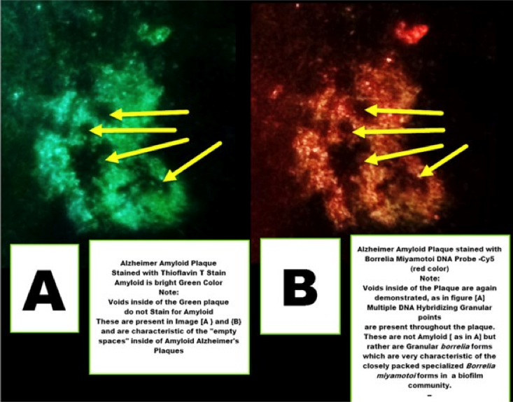 Vor allem der Fall eines Feuerwehrmannes, Paul Christensen, brachte ihn viel weiter. Dr. MacDonald konnte zeigen, dass die Hirnareale mit Alzheimer-ähnlichem Schaden die gleichen waren wie die Areale mit Spirochäten-DNA. Er benutzte dazu fluoriszierend gefärbtes Bb-DNA.