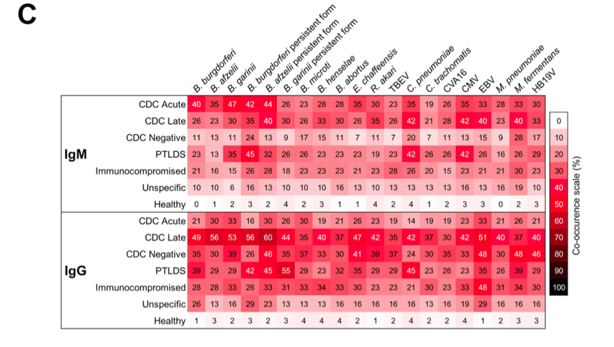 IgM and IgG responses by individual patient categories to 20 microbes. Patients are classified according to the Centers for Disease Control and Prevention (CDC) and other categories