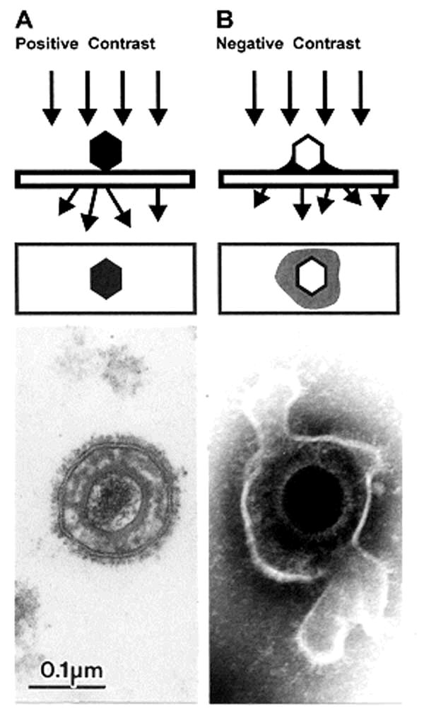 appearance after positive and negative stain electron microscopic. A. Positive staining. Samples undergo a lengthy process of fixation, incubation with heavy metal ions (osmium, uranyl), dehydration, embedment, ultrathin sectioning, and staining. Chemical moieties in the object show differential affinities for the heavy metal stains, resulting in a clear outline of the viral bilayer envelope, viral envelope proteins, nucleocapsid, and the dense nucleic acid containing core. B. Negative staining. After a brief fixation, samples are mounted directly on electron microscopic grids and stained as in Figure 4. The electron-dense stain (phosphotungstic acid [phosphotungstic acid], uranyl acetate, and the like) penetrates the virion and embeds the particle in a matrix of stain. Due to density differences between the stain and weakly scattering biological components of the virion, the virion appears as a transparent and detailed reverse (negative) image. Penetration of stain into the nucleocapsid provides a dense core with the crenellated appearance presented by the central channel of capsomers on the nucleocapsid surface. Viral surface proteins appear as projections from the labile envelope. Phosphotungstic acid stained. Bar = 100 nm.