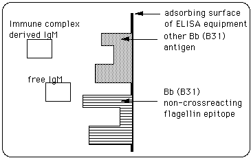 We previously reported on the efficacy of the enzyme-linked IgM capture immune complex (IC) biotinylated antigen assay (EMIBA) for the seroconfirmation of early Lyme disease and active infection with Borrelia burgdorferi (enhanced efficacy due to elimination of competition between immunglobulins and other components for binding sites on antigen, J. Gruber). In earlier work we identified non-cross-reacting epitopes of a number of B. burgdorferi proteins, including flagellin.
