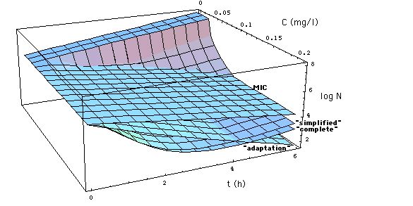 when the meropenem concentration C is by definition near MIC, the MIC model gives a number of surviving bacteria typically deviating from the experimental values by less than plus or minus one order of magnitude.