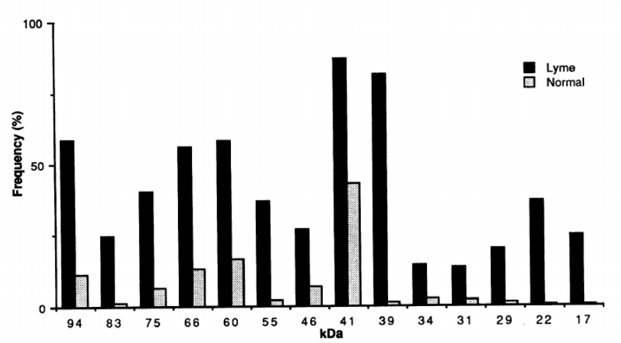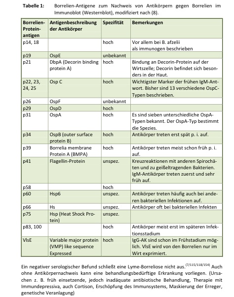 For "epidemiological purposes" the CDC eliminated from the Western Blot analysis the reading of bands 31 (OspA) and 34 (OspB). These bands are so specific to Borrelia burgdorferi that they were chosen for vaccine development. Since a vaccine for Lyme disease is currently unavailable, however, a positive 31 or 34 band is highly indicative of Borrelia burgdorferi exposure. Yet these bands are not reported in commercial Lyme tests. (Quelle: International Lyme and Associated Disease Society (ILDAS), Basic Information about Lyme Disease)